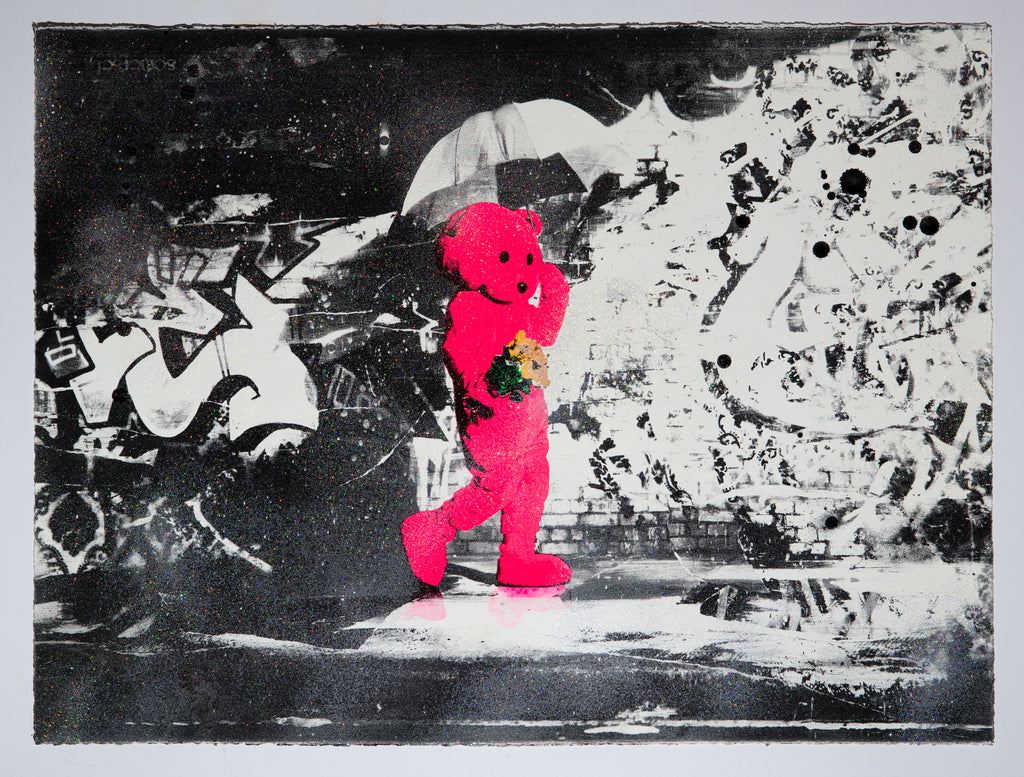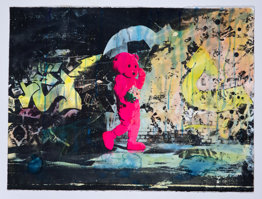 Exploring existential subjects within a contemporary narrative his work stands alone in its composition and provoking content and subject matter. LUAP’s most iconic series depicts a Pink Bear come-to-life and is placed in the real world acting as a metaphor for discovery and exploration. The costumed figure – a striking motif in his work – exists between reality and make-believe, youthful innocence and adult corruption, leading a lifestyle that looks simultaneously enviable and questionable.