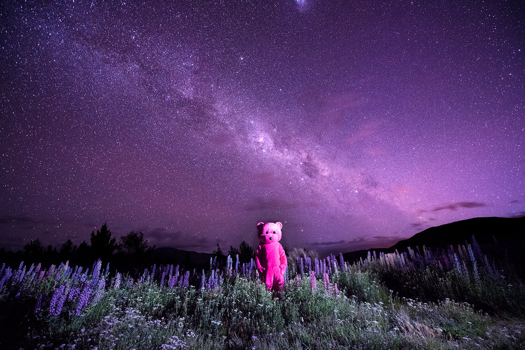 Exploring existential subjects within a contemporary narrative his work stands alone in its composition and provoking content and subject matter. LUAP’s most iconic series depicts a Pink Bear come-to-life and is placed in the real world acting as a metaphor for discovery and exploration. The costumed figure – a striking motif in his work – exists between reality and make-believe, youthful innocence and adult corruption, leading a lifestyle that looks simultaneously enviable and questionable.